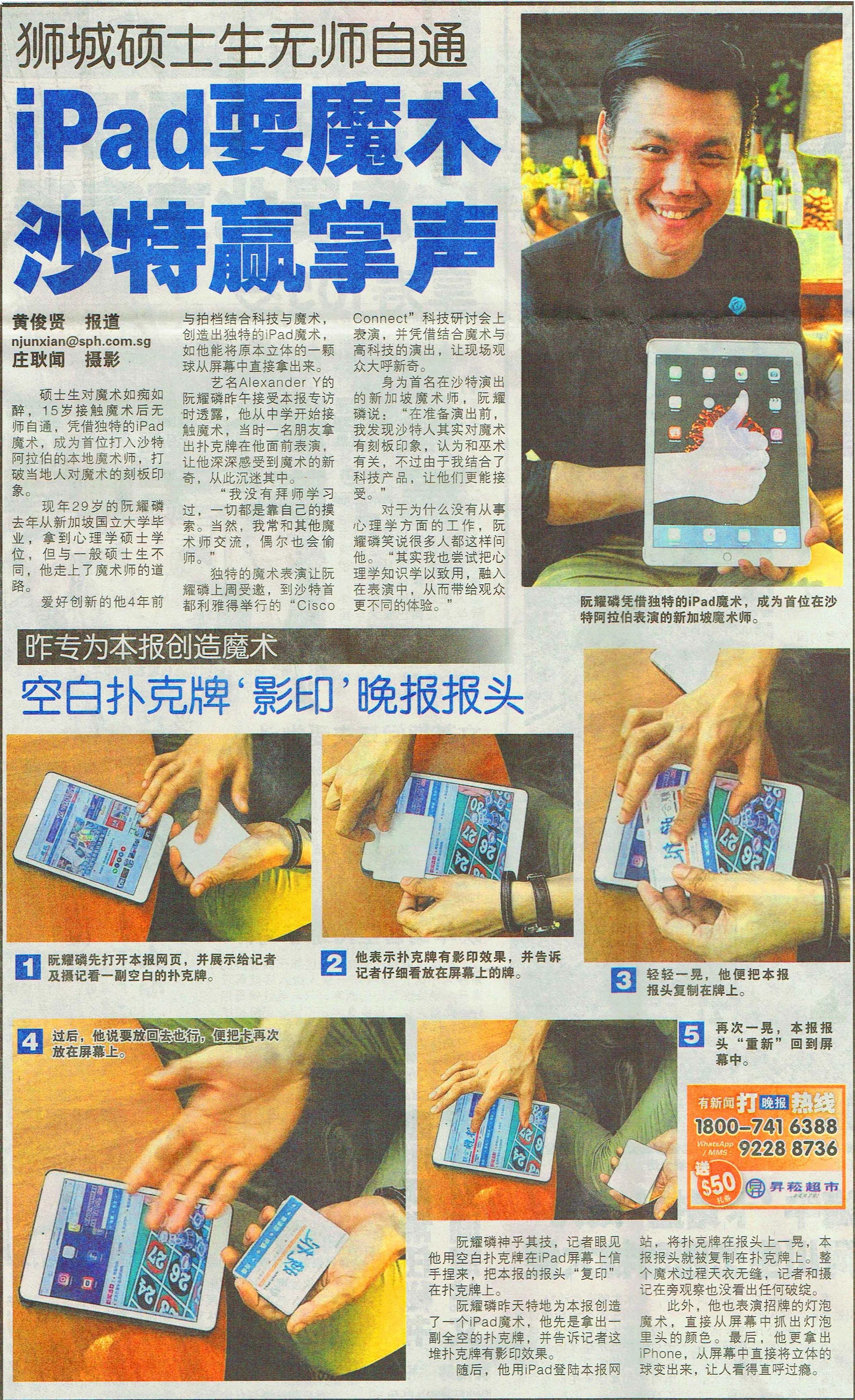 Since the age of 15, Masters Graduate Alexander Yuen had been deeply passionate about magic and illusion. The self-taught magician had even created illusion utilizing the iPad, becoming the first Singaporean Magician to perform in Saudi Arabia, breaking the traditional impression of magic in Saudi Arabians.